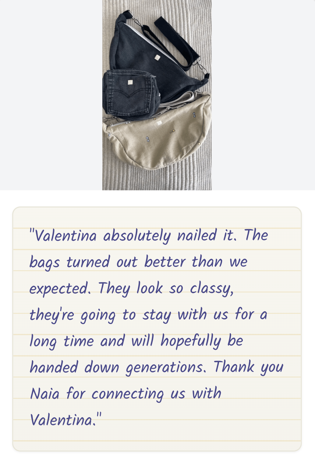Valentina’s pieces stand out for their exceptional quality, attention to detail, and beautiful finishes — every stitch reflects her dedication to craft. She’s known for using every bit of fabric so nothing goes to waste, creating timeless jackets, quilted vests, summer tops, and her signature Banana Bag.